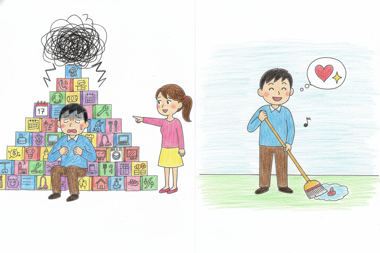自分にとって辛かったのは、洗濯や皿洗いなどが「やらなければいけないタスク」になってしまうことでした。たとえば、キッチンの洗い物に関しては、何日溜めてはいけない、というルールは特になかったので、自分の中でタスク化されませんでした。一方、我が家のルールとして、洗濯物を洗ったらすぐ干さなければならない、干したものは日が暮れる前に回収しなければならない、というルールがありました。妻が洗濯機を回して出かけると、この2つは必ずやらなければならないタスクになってしまいます。